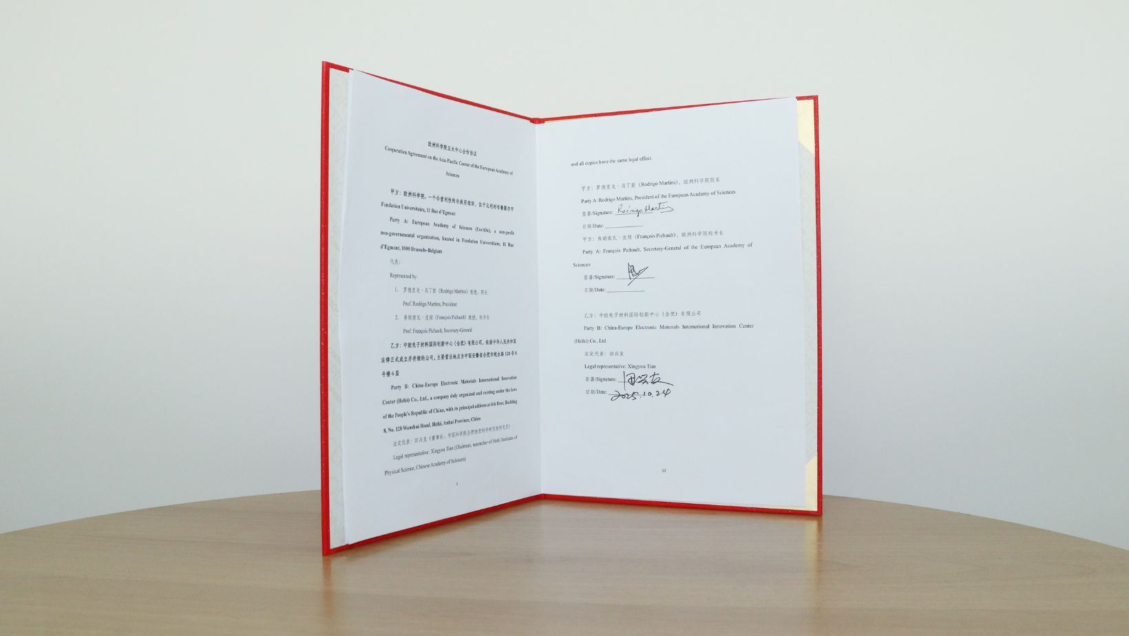 The agreement was signed on October 2025 between EurASc –represented by its President, Prof. Rodrigo Ferrão de Paiva Martins, and Secretary-General, Prof. François Pichault – and the China- Europe Electronic Materials International Innovation Center(Hefei) Co., Ltd., represented by Prof. Tony Xingyou Tian, Researcher at the Hefei Institutes of Physical Science, Chinese Academy of Sciences, and Professor and Vice President of Anhui Normal University.